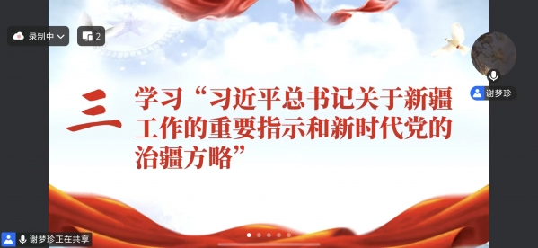 首先是理论学习环节,一上来由支部委员胡鑫月领学了习近平总书记关于加强和改进民族工作的重要思想;然后,由支部委员周思彤领学了习近平总书记关于西藏工作的重要指示和新时代党的治藏方略;最后,由支部委员刘玄领学了习近平总书记关于新疆工作的重要指示和新时代党的治疆方略。