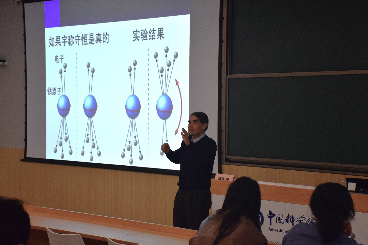 讲座以楼宇庆教授特为缅怀杨振宁先生10月18日去世所写的一副挽联拉开序幕,上联是“对称非对称 二合著文章 一言九鼎 尽显绝代宗师才华横溢数学物理思维精妙精准”,下联为“破缺就破缺 众独立实验 千真万确 包罗瀛寰宇宙恣意纵贯规范超然运行神秘神奇”。 挽联不但文字精妙,更写出了对杨先生深厚的敬意与怀念,既蕴有诗意又富有哲思。寥寥数语不仅凝练了杨振宁先生深刻影响物理学走向的核心贡献,更饱含着对物理宗师的景仰与敬重之情。接着,楼教授围绕杨振宁先生的学术生涯展开深入分享。不同于新闻媒体的常规报道,楼教授还为同学们讲述了许多鲜为人知的幕后故事,让大家看到物理研究过程中更鲜活更生动更真实的细节,感受科学前沿发现的魅力,体验不同层面上的互补合作与激烈竞争,理解营造健康学术环境的迫切性和必要性。楼教授从1954年杨振宁与Mills合作发表的论文讲起,又详细讲述了李政道与杨振宁1956年合作发表的论文。关于李杨1956年文章,楼教授再次明确指出一个长期普遍存在于大量中外正式文献、专家评论和新闻媒体中的严重误解,即该文本身事实上并未提出、推导、预言和证明弱作用中宇称一定不守恒亦或推翻弱作用中宇称守恒。该文的几个关键结果是发现了一个令人吃惊的事实,即以往所有弱作用实验从未检验宇称是否守恒;通过深入系统的理论分析,提出了用‘赝标量’来检验宇称是否守恒的标准;在与若干物理学家交流的基础上,提出了5个非常具体的不同类型的弱作用实验来检查宇称是否守恒。楼教授还特别着重强调了实验物理学家吴健雄在率先实验发现钴60-β衰变这一弱作用过程中宇称不守恒的关键主导作用。楼教授指出,当时物理界主流压倒性的观念或信条是宇称绝对应当是守恒的,几位国际上大名鼎鼎的物理学家为此信誓旦旦,甚至下赌注,因此很多实验物理学家和有条件的重要物理实验室不屑于尝试用李政道和杨振宁提出的新检验标准和建议的若干实验来系统地检查宇称是否守恒。仅有为数不多的物理学家坚持实验检验至上的原则并一往无前地大胆探索,而正是这部分人的执着和信念,最终导致了深远影响物理学发展的石破天惊的重大突破,即弱作用中宇称不守恒。此外,楼教授还穿插介绍了多位物理学家的科研故事。