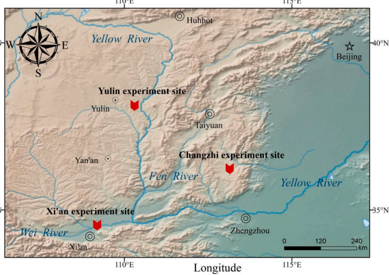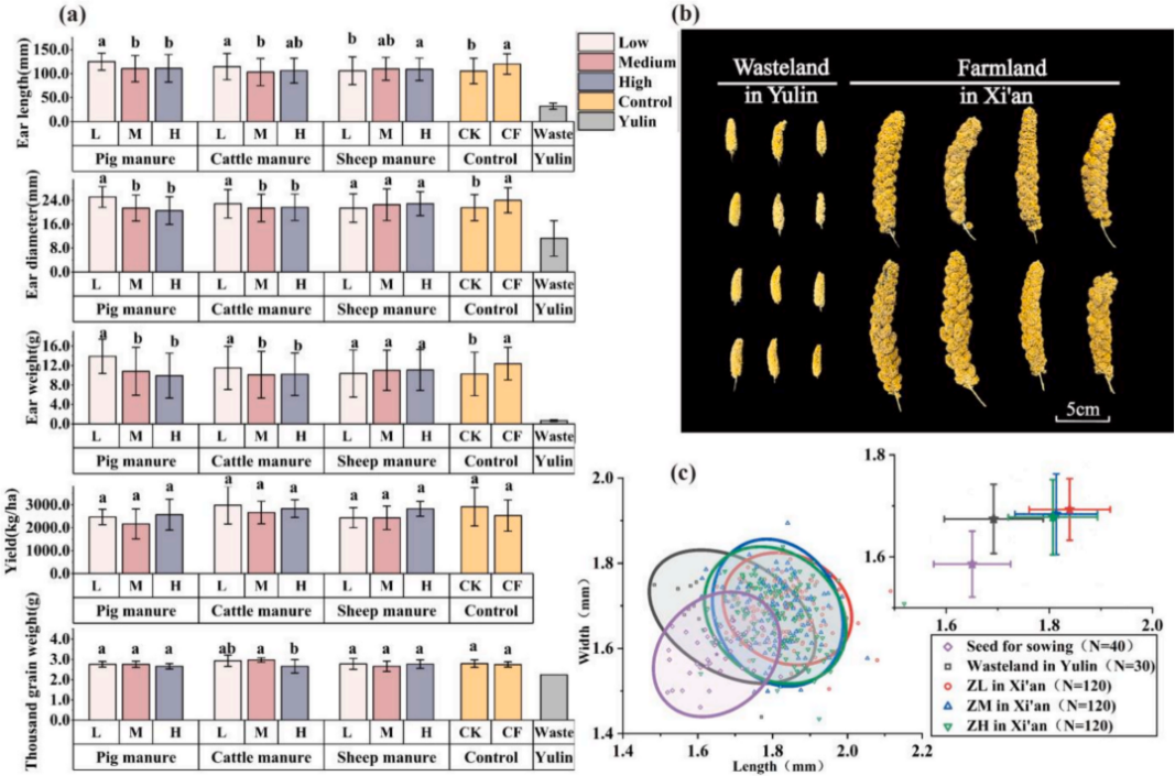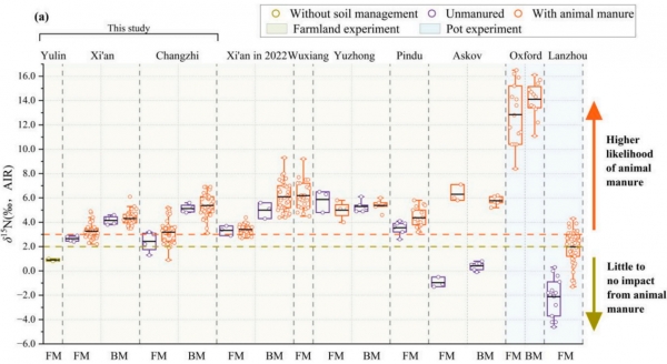 种植实验于2023年的同一个生长季在榆林撂荒地以及西安、长治的农田同步展开,西安和长治地点土壤在质地、结构等特征属性上存在明显差异。在榆林地点播种粟黍种子后不进行任何人为管理,最终仅粟存活;西安与长治两地农田实验设计完全相同,每种作物均设置猪、牛、羊3个粪种,每一粪种设置3个施肥梯度,并设置不施肥、施复合肥作为对照,即共11个处理,每个处理设置4个重复。作物成熟后采集样品进行了农艺性状、氮稳定同位素及土壤无机氮等要素的测试,共计获取2121份样品数据。