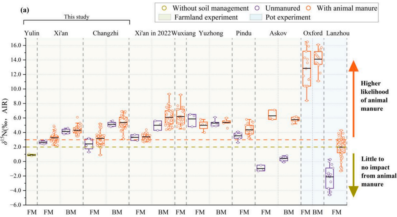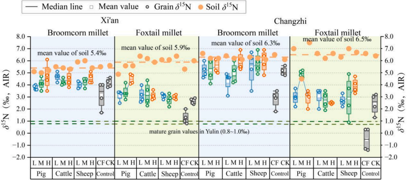 此外,本研究还揭示出粟和黍两种C4亚型的δ15N值差异,长治与西安地点均表现出相同处理下黍种子δ¹⁵N值显著高于粟种子值,并从土壤硝态氮与铵态氮的角度对粟黍作物的氮素吸收过程进行了讨论,进一步强调了从机制层面深入理解作物氮值对土壤特征及施肥响应的现代过程的必要性。